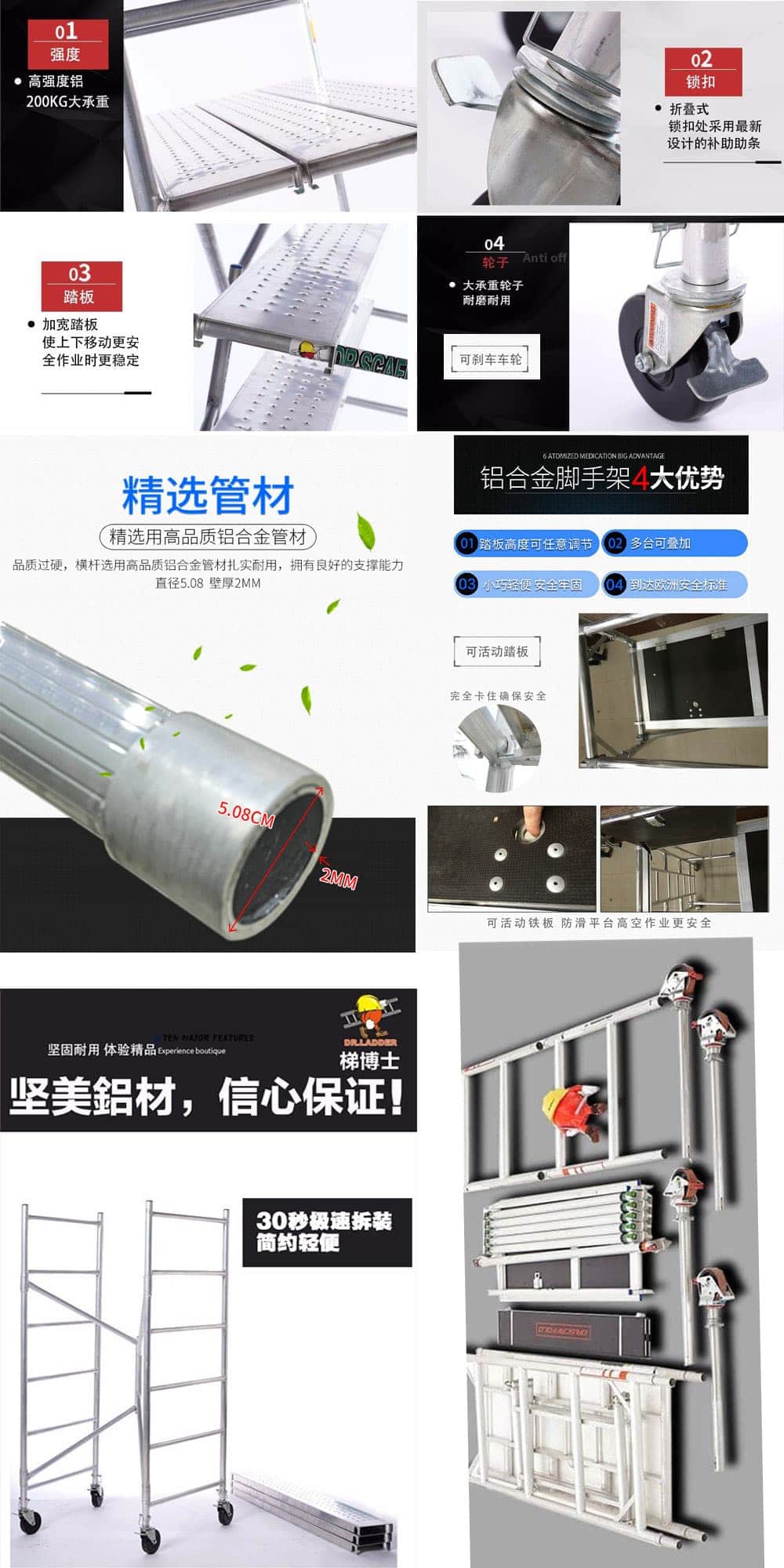 移動式鋁合金腳手架的特點有:承載力強。為了達到EN1004歐盟標準,腳手架采用的是航空級鋁合金材質,拉管直徑為50.8mm,管壁標準厚度為2mm,這種設計承載力足以達到沒平方米為200kg。頂部的平臺踏板最小面積是0.6x2m,足夠達到一個成年人的載重。